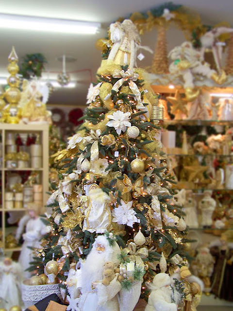 Snowflake ornaments "fall"amongst layers of silver bling, white faux fur, mercury glass, and victorian ribbon.